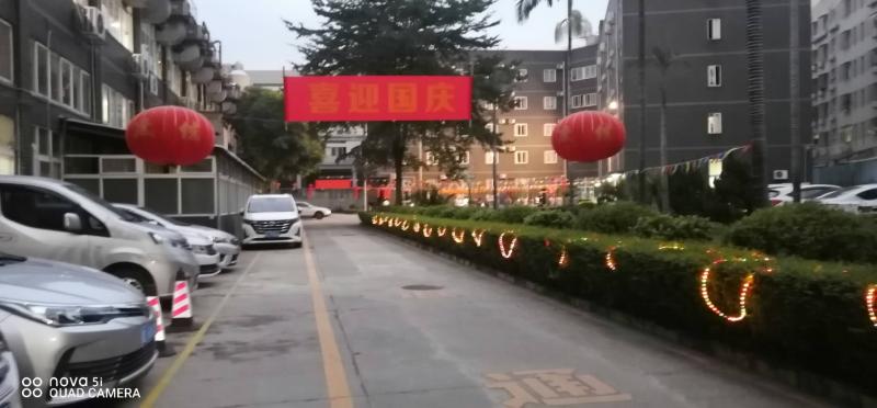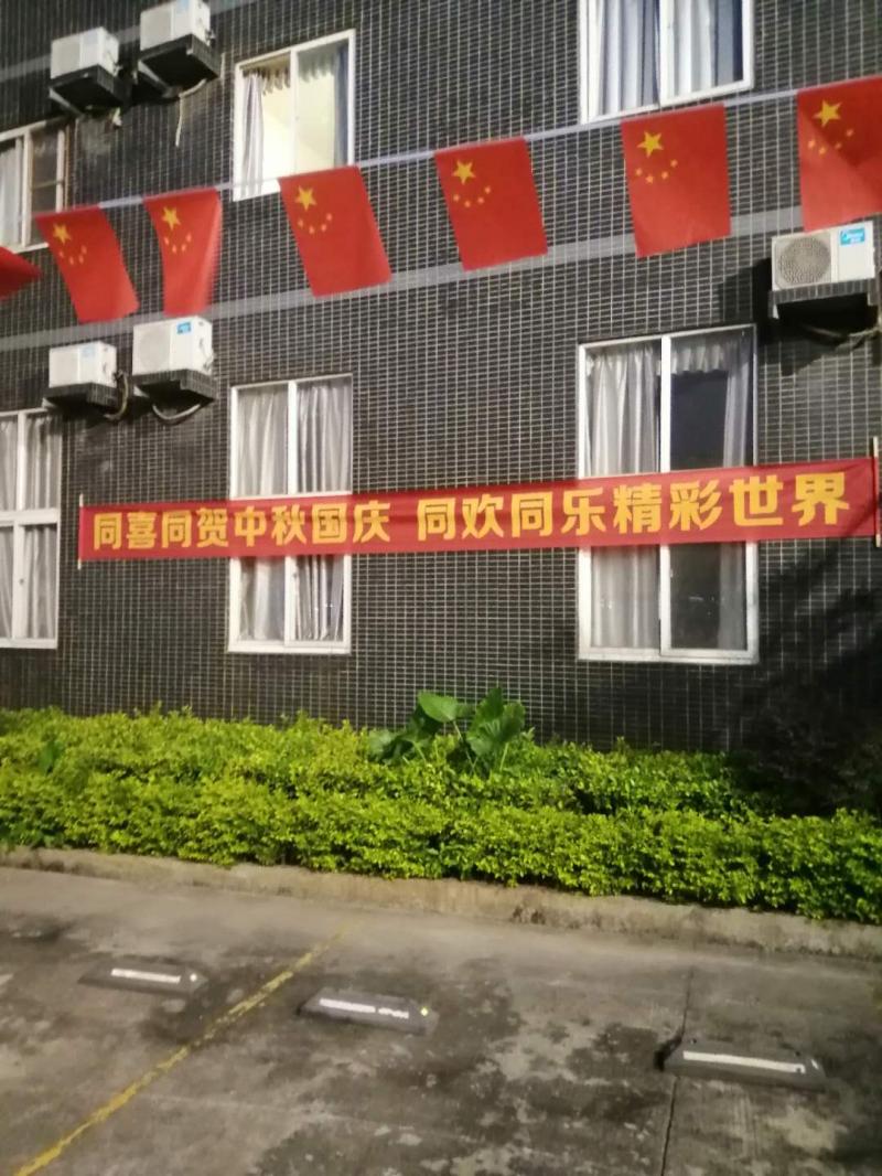 “喜迎中秋”、“同喜同賀中秋國慶,同歡同樂精彩世界”的橫幅,與交相輝映的彩旗和五顏六色的彩條,配著一對大大的紅燈籠,烘托出盛大的節日喜慶。