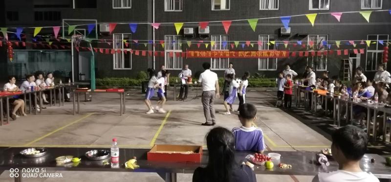 在球場用長桌圍成一個四方形 ,簡單的舞臺就算搭成了,桌上擺滿了水果、糕點、飲料,彰顯節日的主食---月餅當然是桌上的主角。