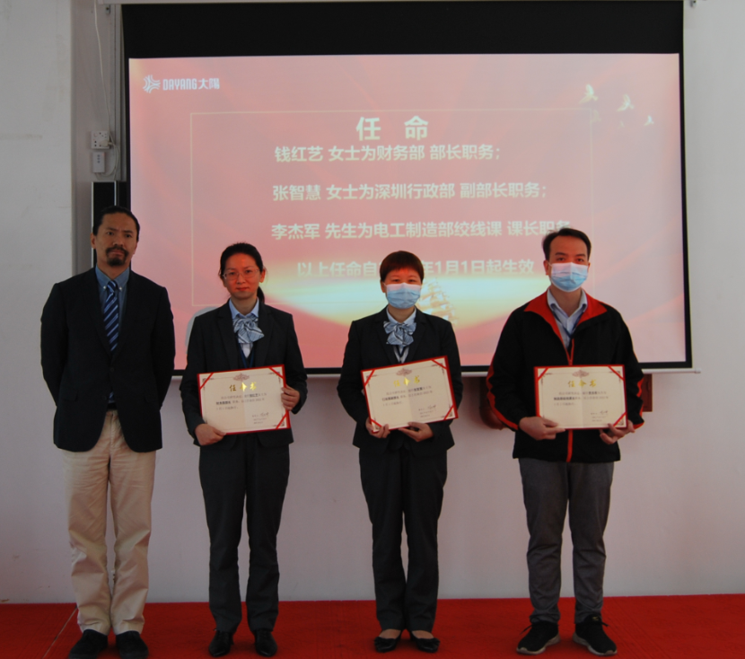 在總結(jié)表彰會上,公司對2021年為公司做出杰出貢獻(xiàn)的單位和個人進(jìn)行了表彰,電工營運中心獲得“質(zhì)量穩(wěn)定獎”,河源營運中心獲得“質(zhì)量進(jìn)步獎”,屈蓬濤、常偉分獲電工和通用銷售冠軍獎,“最具先進(jìn)獎”獲得者11人,“最具潛力獎”獲得者11人,董事總經(jīng)理林淳汶先生為獲獎員工頒發(fā)了獎杯和證書。老板為服務(wù)公司十周年、二十周年、二十五周年的榮譽員工頒發(fā)了榮譽證書,并和榮譽職員合影留念,和往年一樣,老板發(fā)表了感人肺腑的講話。同時在會上公布了三項人事任命,任命錢紅藝為大陽財務(wù)部長,任命張智慧為深圳大陽行政部副部長,任命李杰軍為深圳大陽絞線課課長。